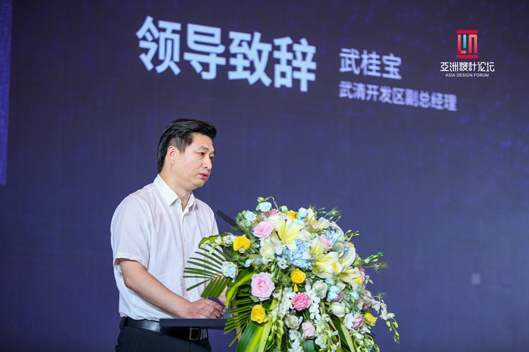 天津武清经济技术开发区副总经理武桂宝致开幕词,倡导以设计为源动力,多元共创,促进行业共振,推动文化创意和设计服务与其他产业的融合发展,为产业注入情怀,把产品变得有情感,有温度。